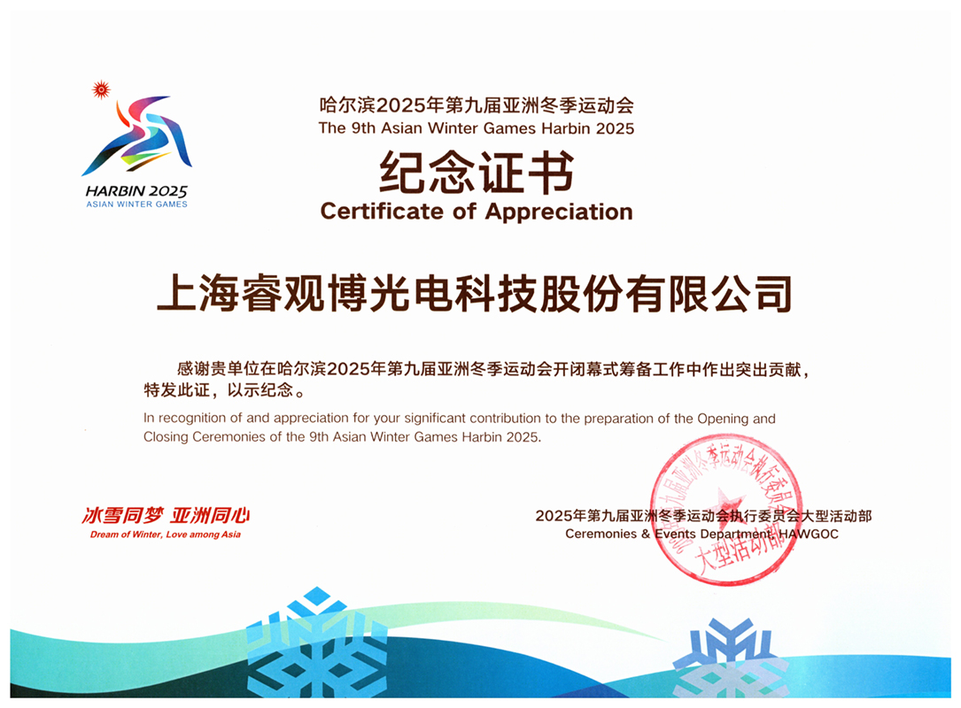 為感謝上海睿觀博光電科技股份有限公司在哈爾濱第九屆亞洲冬季運動會開閉幕式籌備工作中做出突出貢獻,2025年第九屆亞洲冬季運動會執(zhí)行委員會大型活動部特頒發(fā)紀(jì)念證書,以示紀(jì)念。
